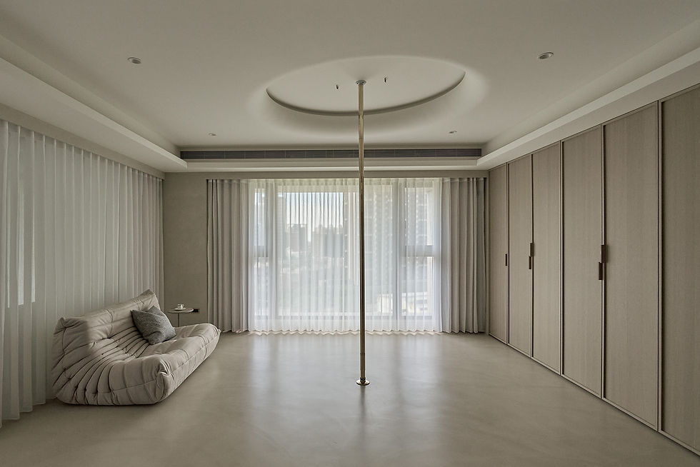 Transitioning seamlessly from the walls to the ceiling, one will notice that the design features gracefully curved edges that form smooth arcs, enhancing the captivating play of light and shadow throughout the space. Notably, the rhythm zone takes a minimalist approach, providing flexibility for various use, while the kitchen boasts long glass sliding doors. These doors not only facilitate dynamic space configuration but also beautifully showcase the enchanting effects of light refraction.